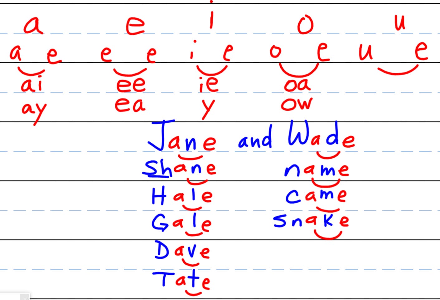 Dictation of Story Words: Jane, Shane, Hale, Gale, Dave, Tate, name, came, snake